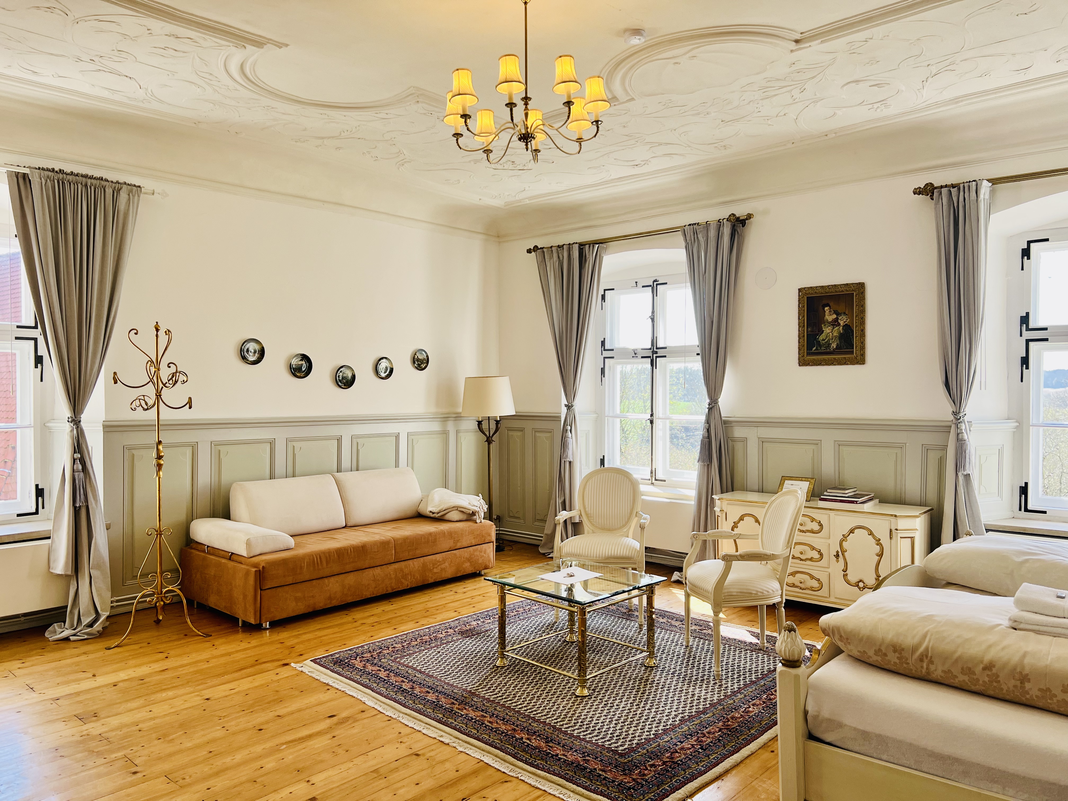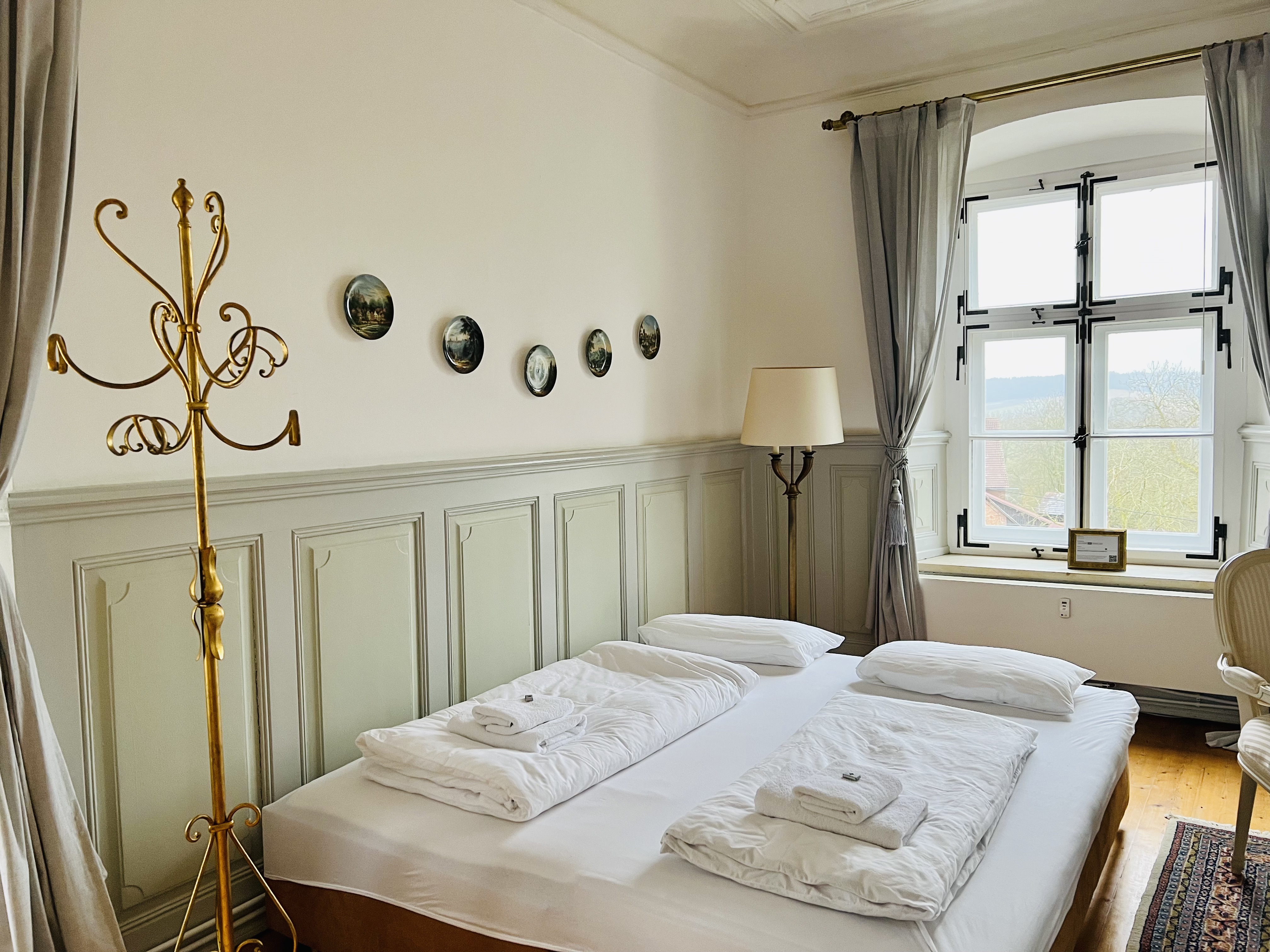 Der Wohn-Schlafraum verfügt über ein Doppelbett (180×200). Der lichtdurchflutete Raum hat drei große Fenster, zwei davon zum Westgarten des Schlosses. Der Blick aus dem Fenster lässt das weitläufige Tal mit dem alten Baumbestand und der 400-jährigen Eiche erscheinen.