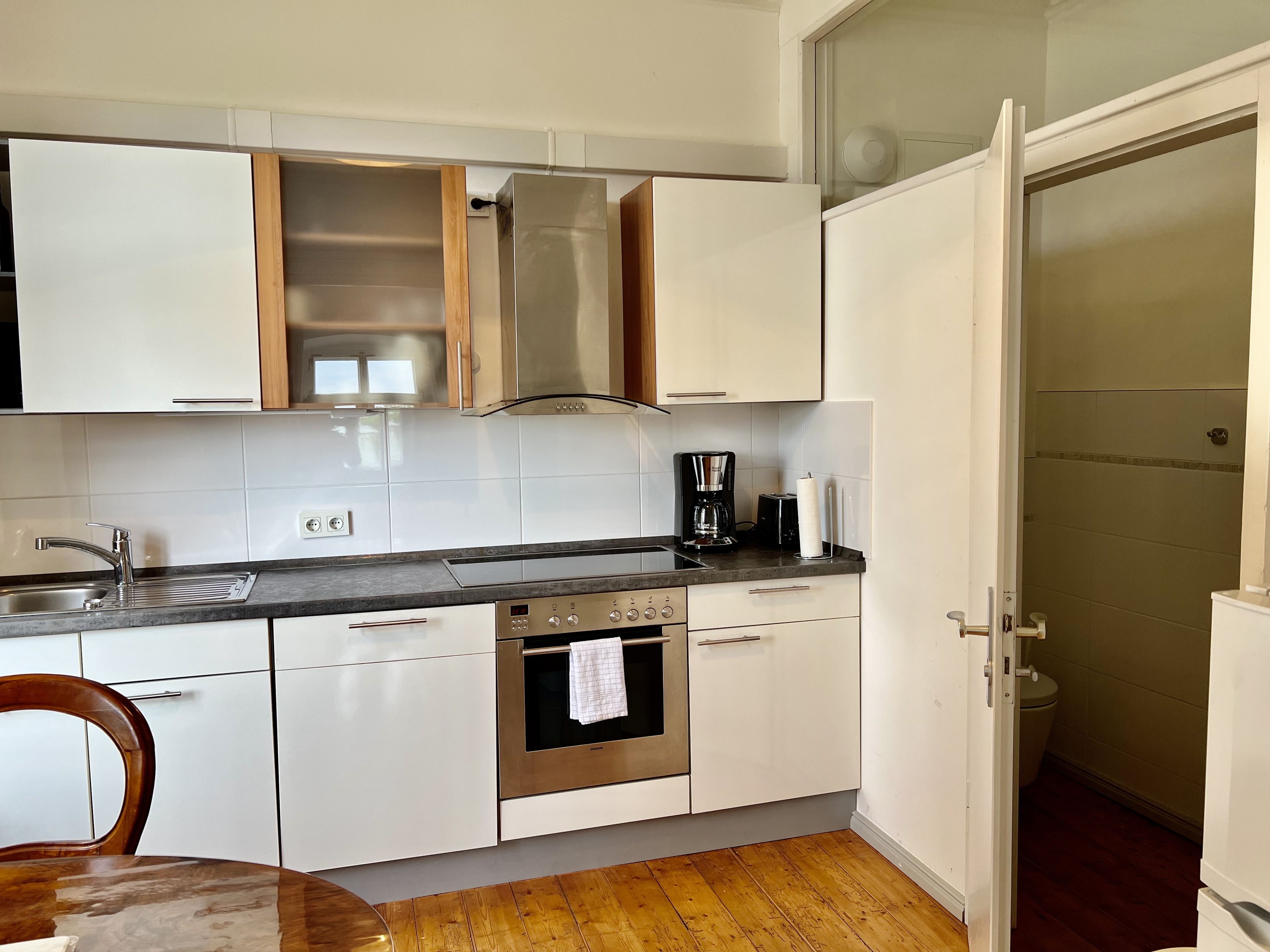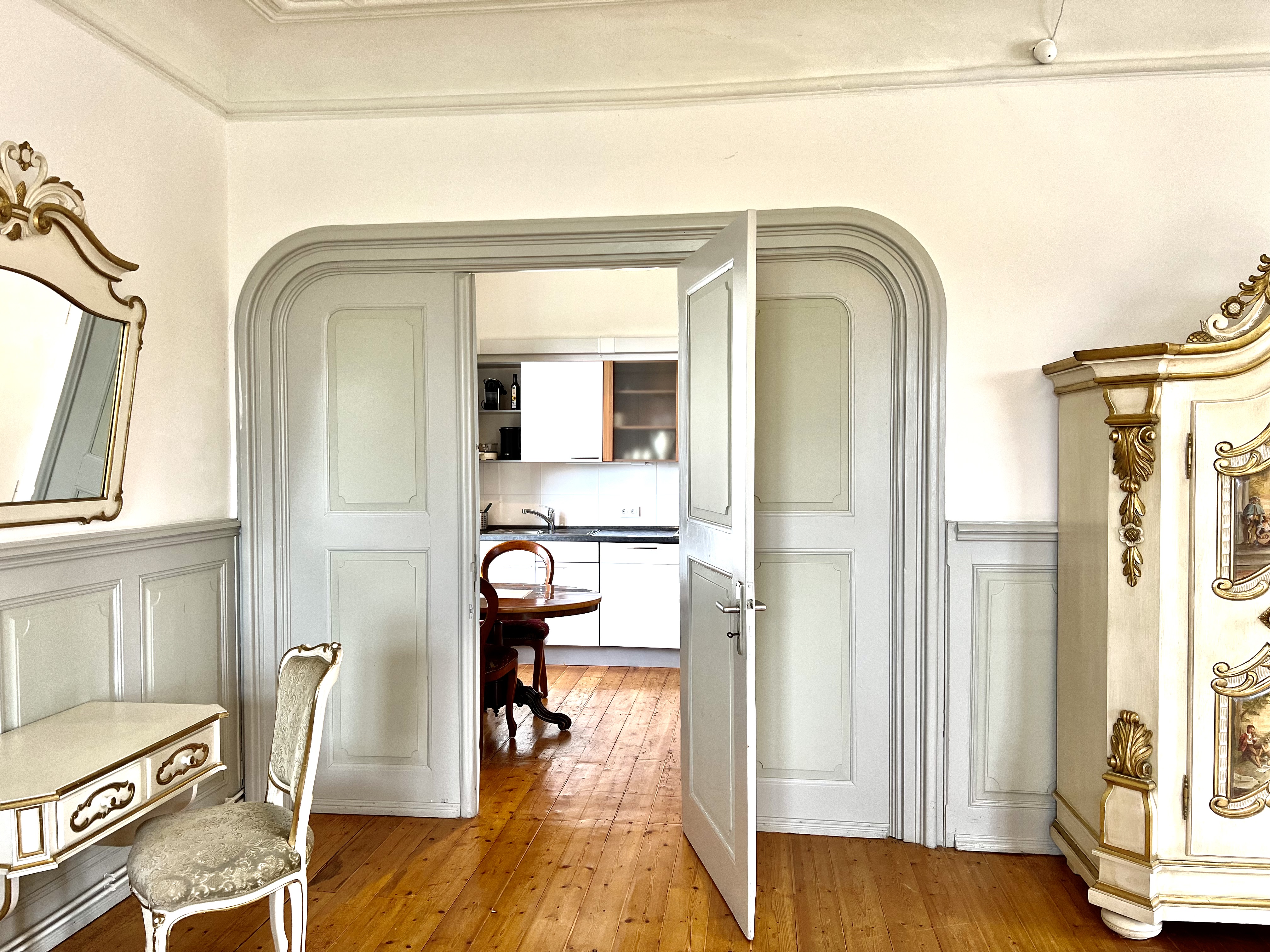 Eingerichtet ist das historische Appartement mit Schrank im Vintagestil. Für den dritten und vierten Gast steht eine hochwertige Doppelbettcouch (180x200) bereit. Die voll eingerichtete Küche mit Esstisch befindet sich unmittelbar neben dem Wohnbereich. Die Wohnung hat einen direkten Zugang zum gemeinschaftlich nutzbaren, sehr großen Süd-Westbalkon, vom dem Sie bei einem Glas Wein romantische und spektakuläre Sonnenuntergänge erleben können. Unser freundliches Storchenpaar begrüßt und beobachtet Sie dabei von oben. 🙂
