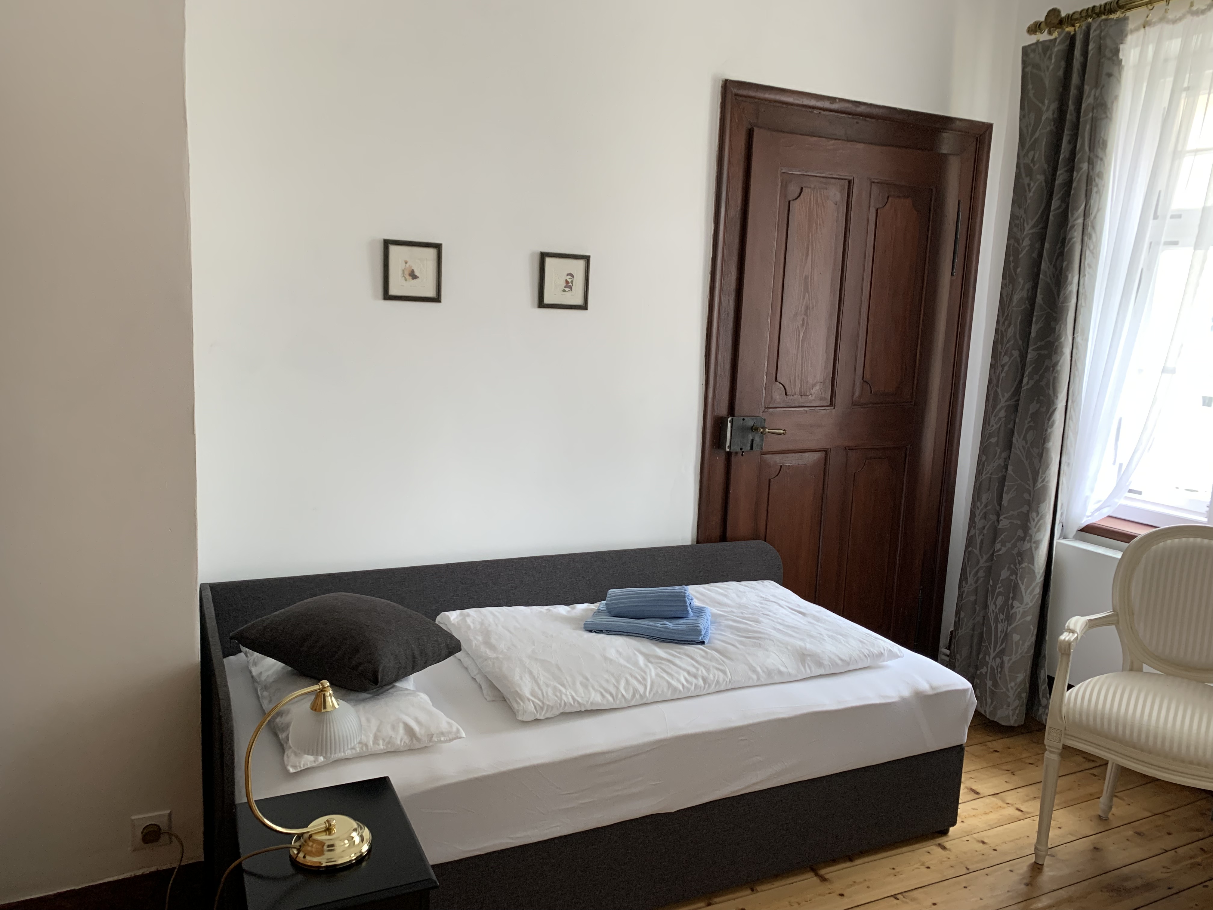 Ein Einzelbett (90x180 – ein zweites Zustellbett auf Wunsch), etwa 9qm groß