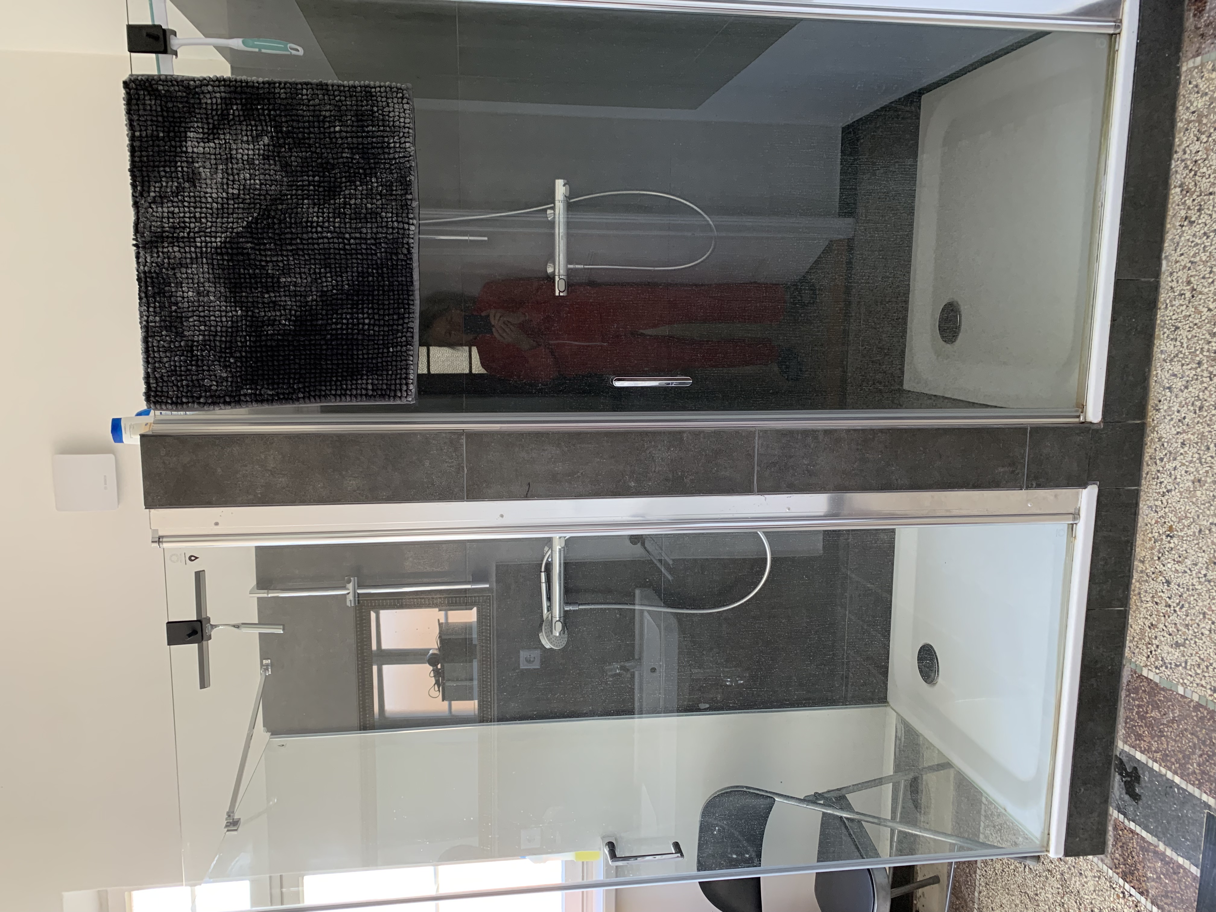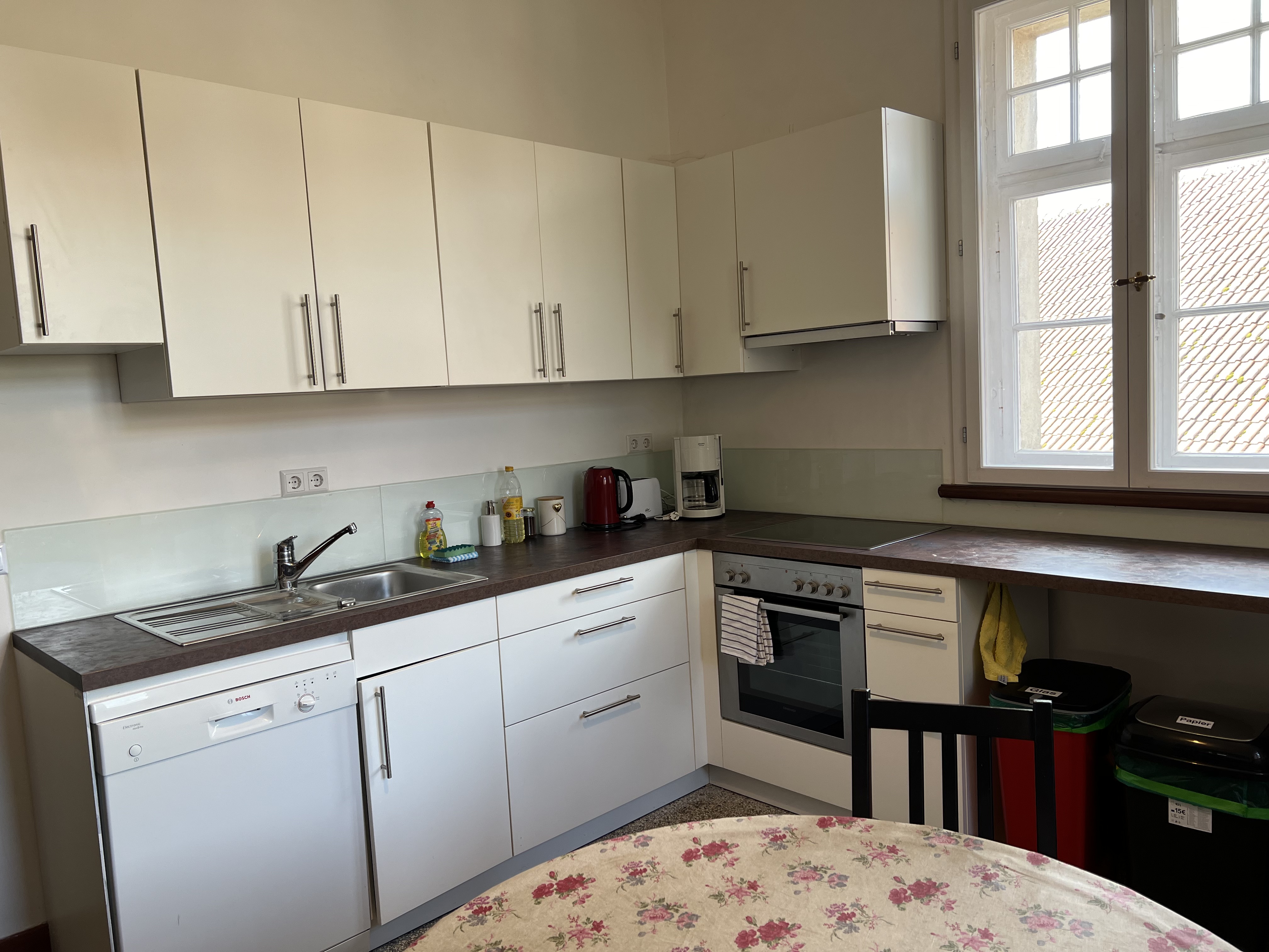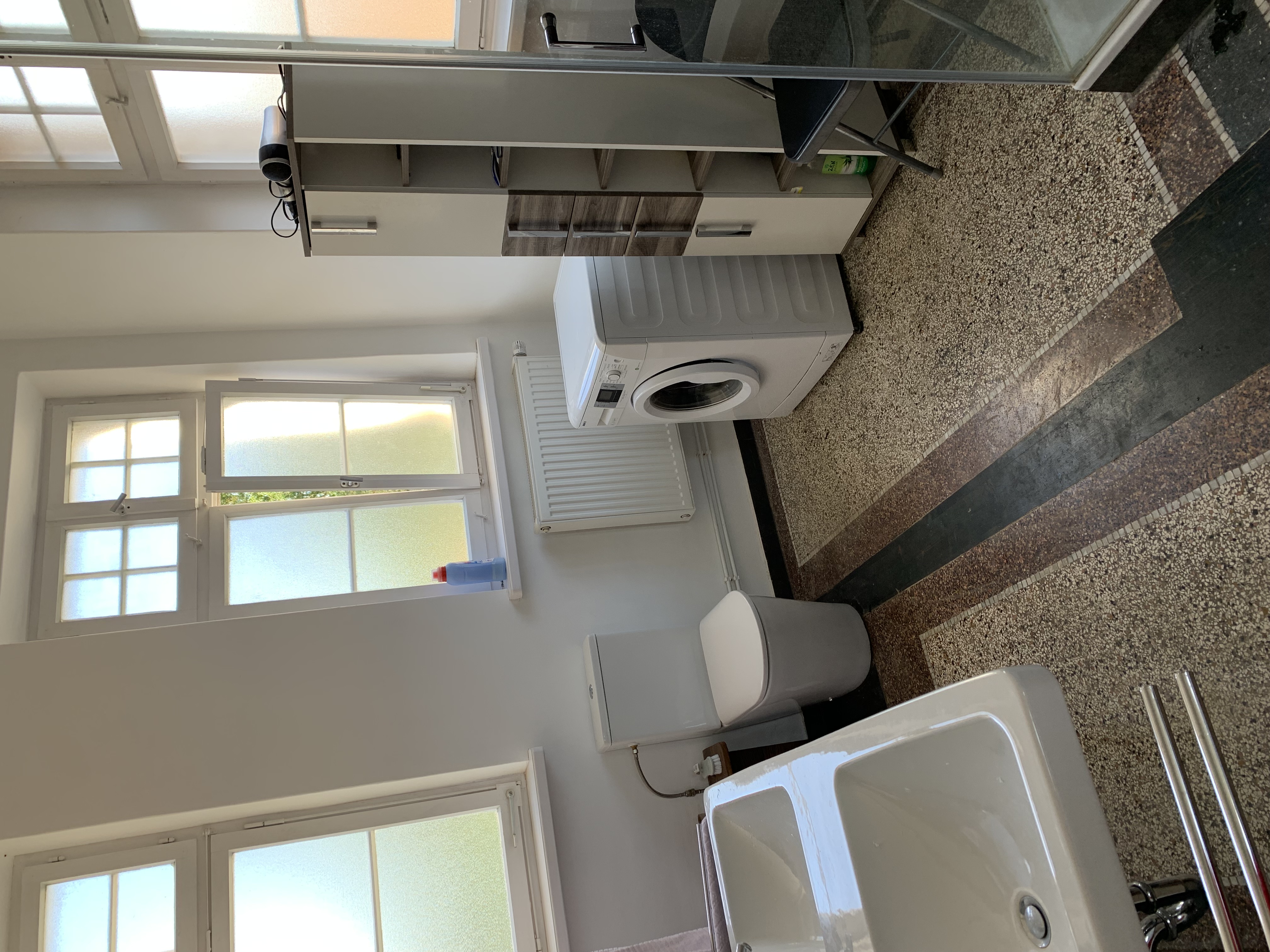 Die voll eingerichtete Küche mit Kühl/Gefrierkombination und Spülmaschine ist über den Flur erreichbar, ebenso das großräumige Badezimmer mit zwei Waschbecken, Toilette und zwei Duschen und einer Waschmaschine. Außerdem gibt es noch eine separate Toilette.