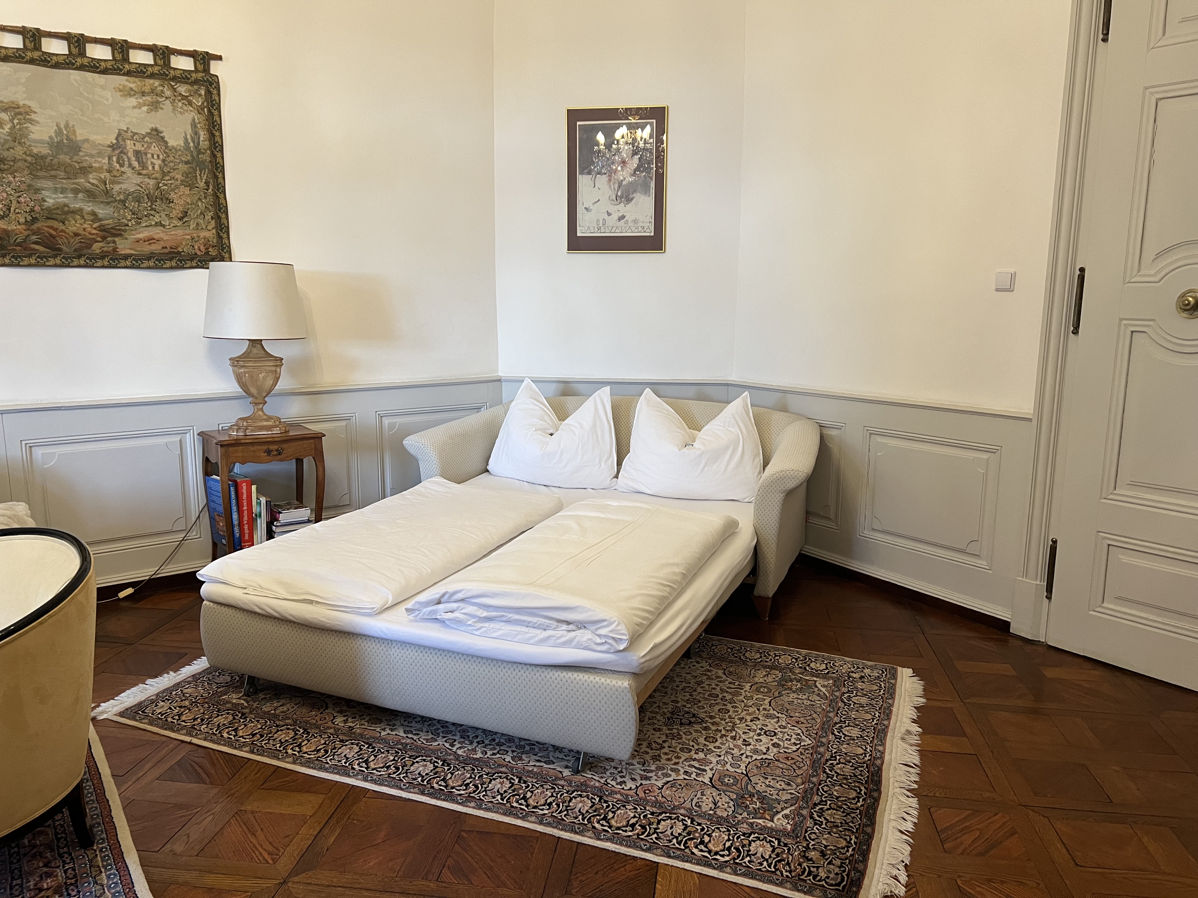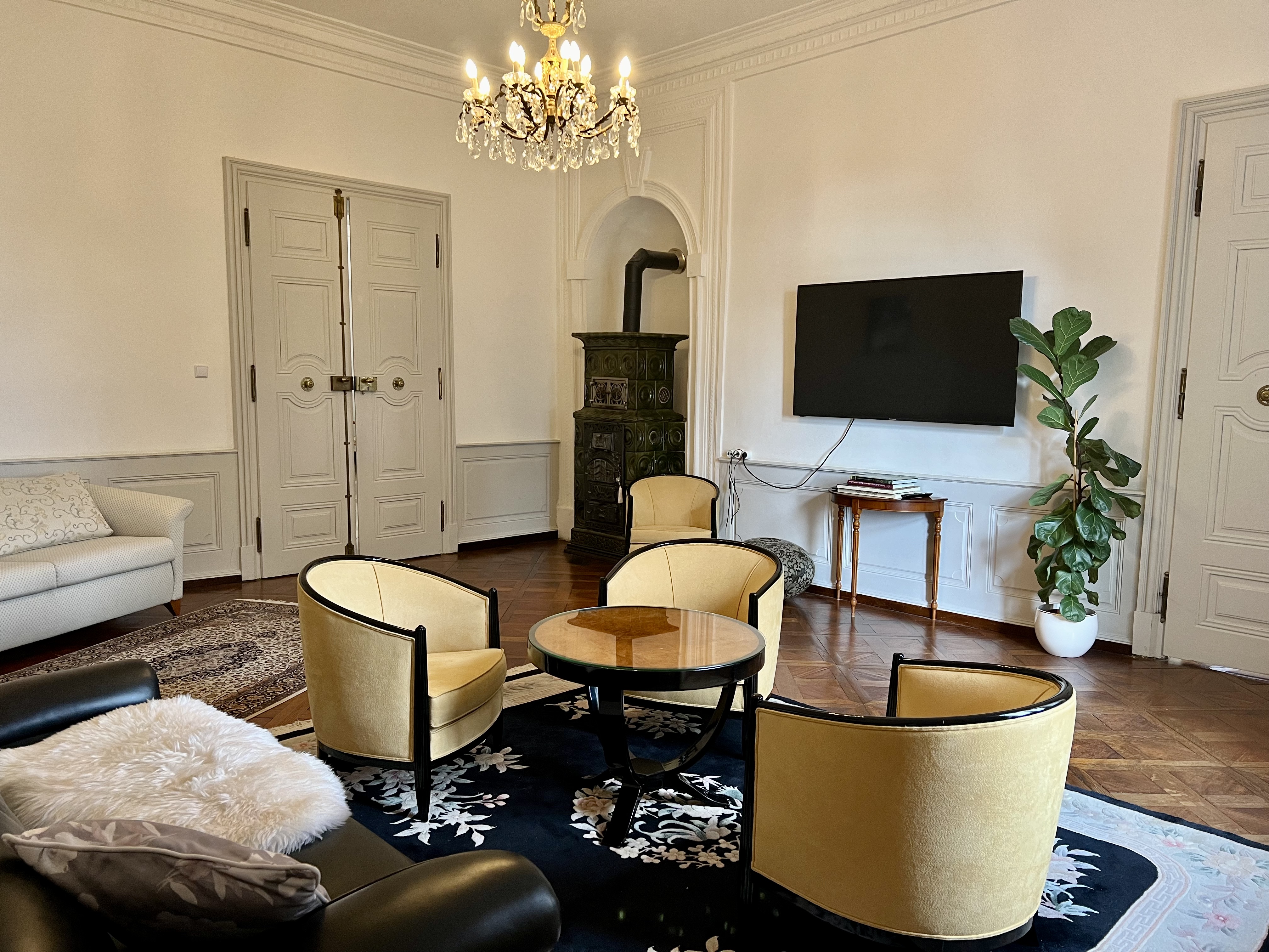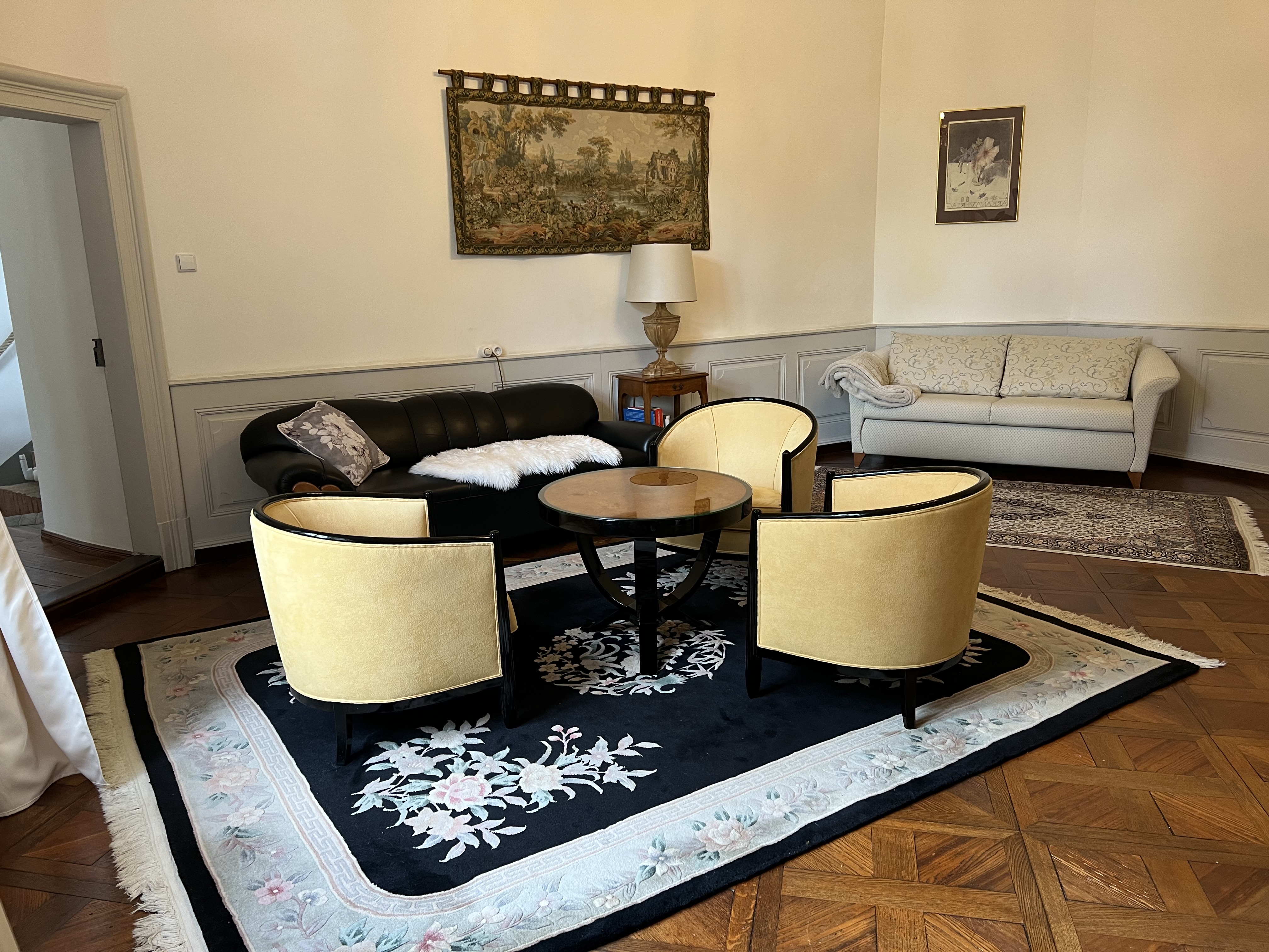 Ebenfalls vom Turm aus gelangen Sie zum Wohnzimmer (mit Art Deco Sitzgruppe) sowie durch die elegante Doppeltüre mit wertvollen Messingbeschlägen von 1785 zum Schlafzimmer.