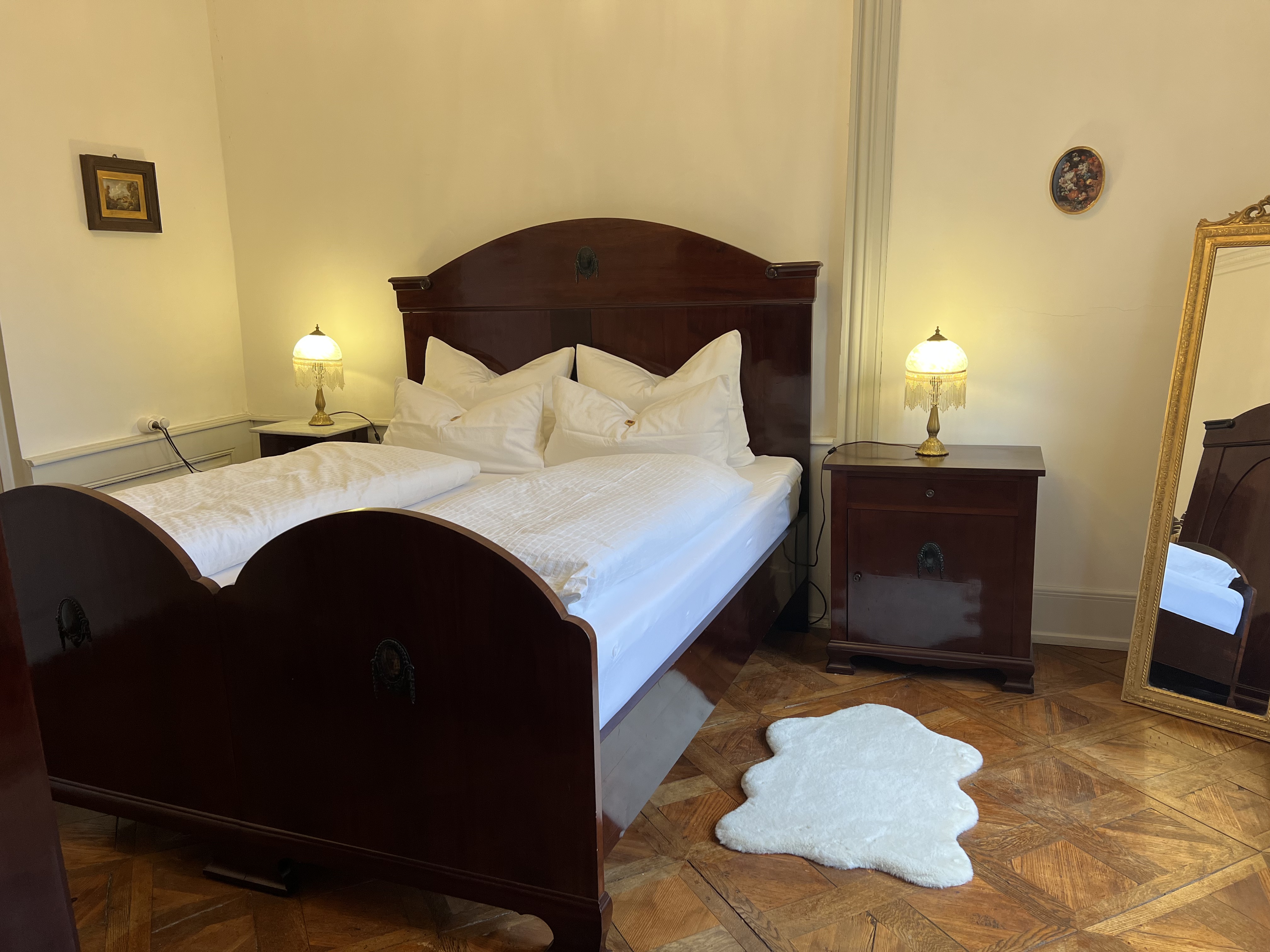 Hochherrschaftlich übernachten Sie hier in einem Mahagoni Queensize-Bett (177x200 cm) und im Wohnzimmer auf einer hochwertigen Schlafcouch (1,60m breit) für 1-2 Personen.