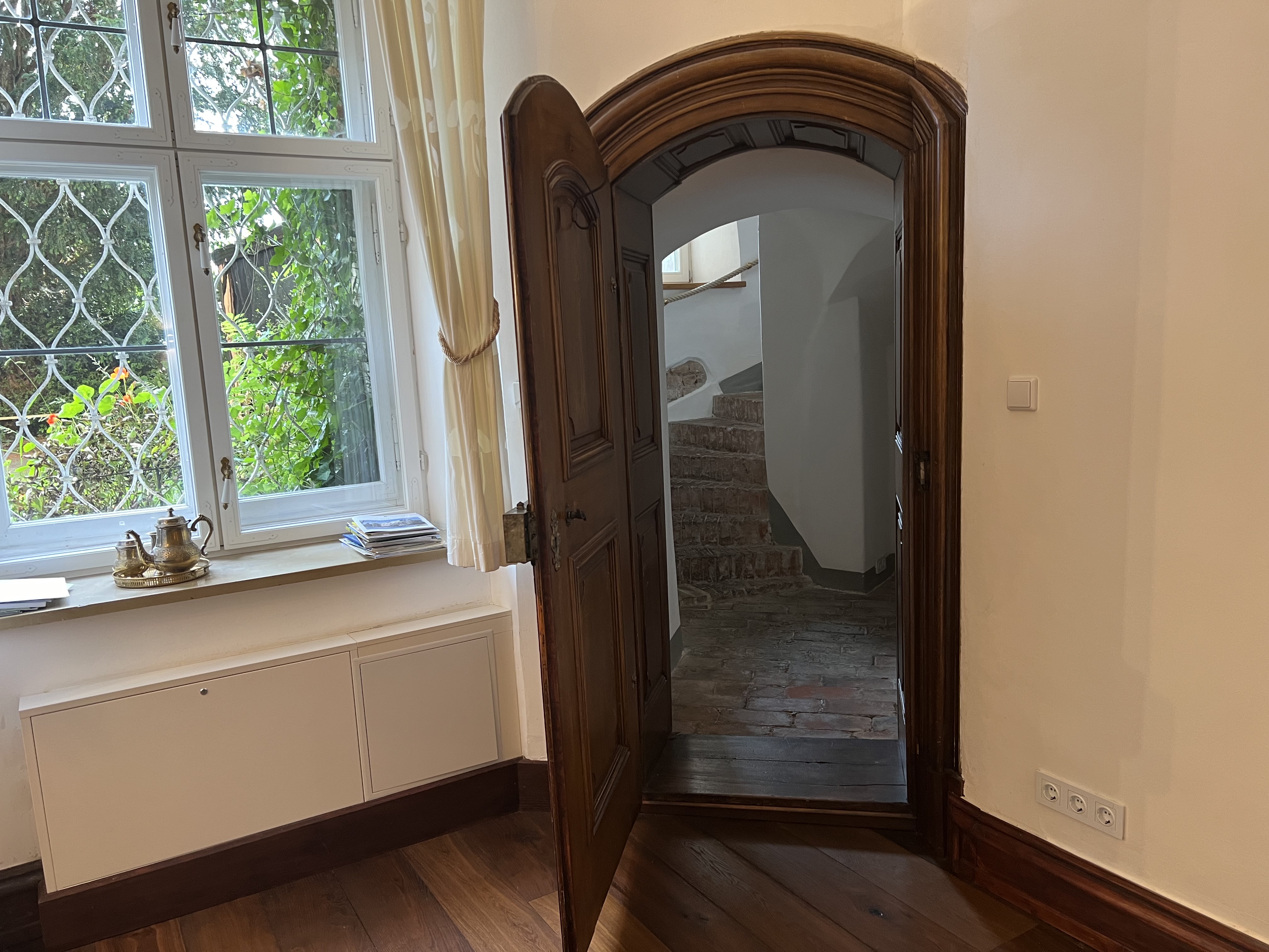 Alles in dieser Wohnung ist historisch, vom Boden bis zur Treppe aus dem 16. Jahrhundert. Sehr große Doppelfenster aus dem 19. Jahrhundert sorgen für viel Licht, Schallschutz von der benachbarten Kirche und eine helle Atmosphäre.