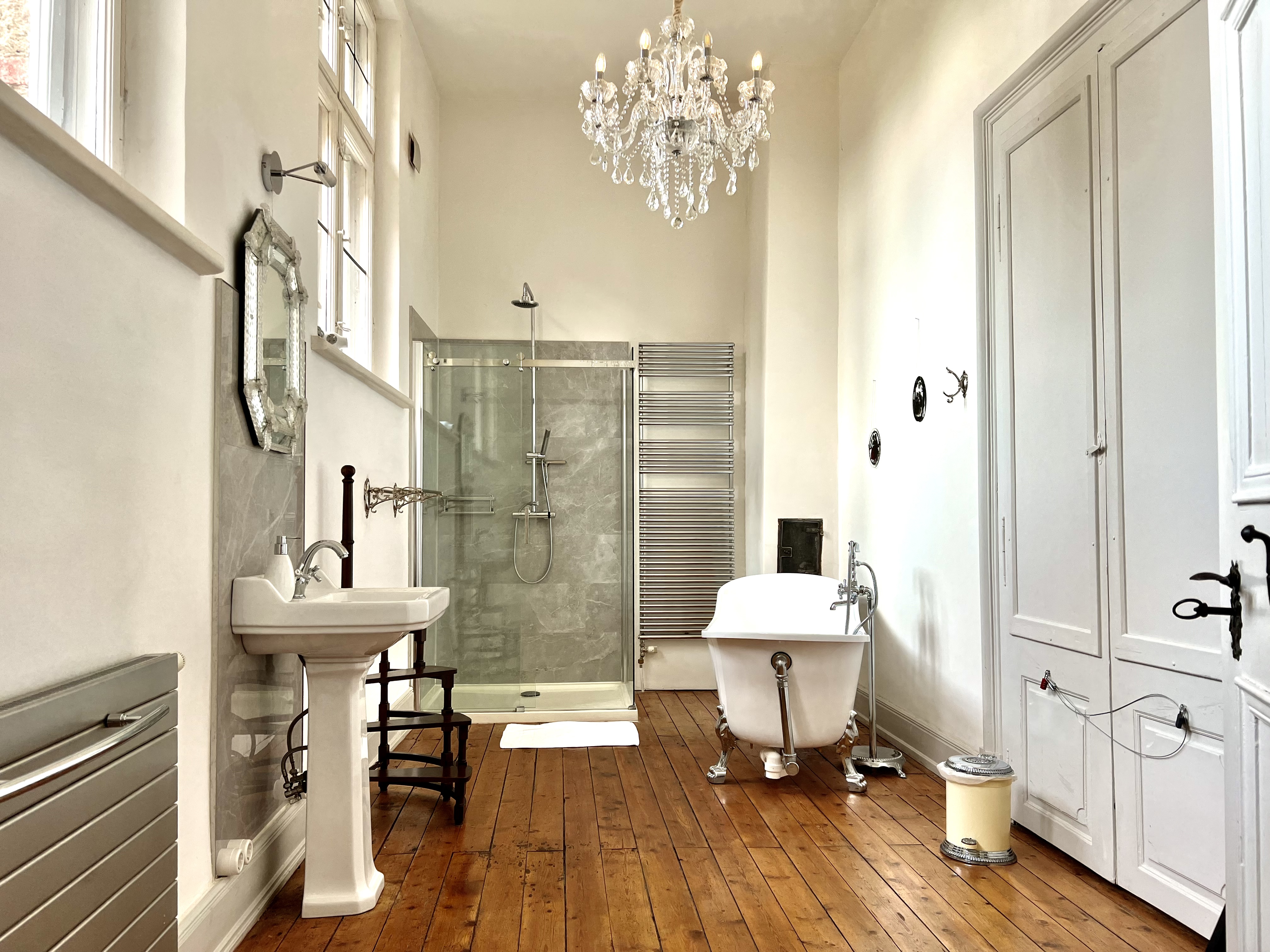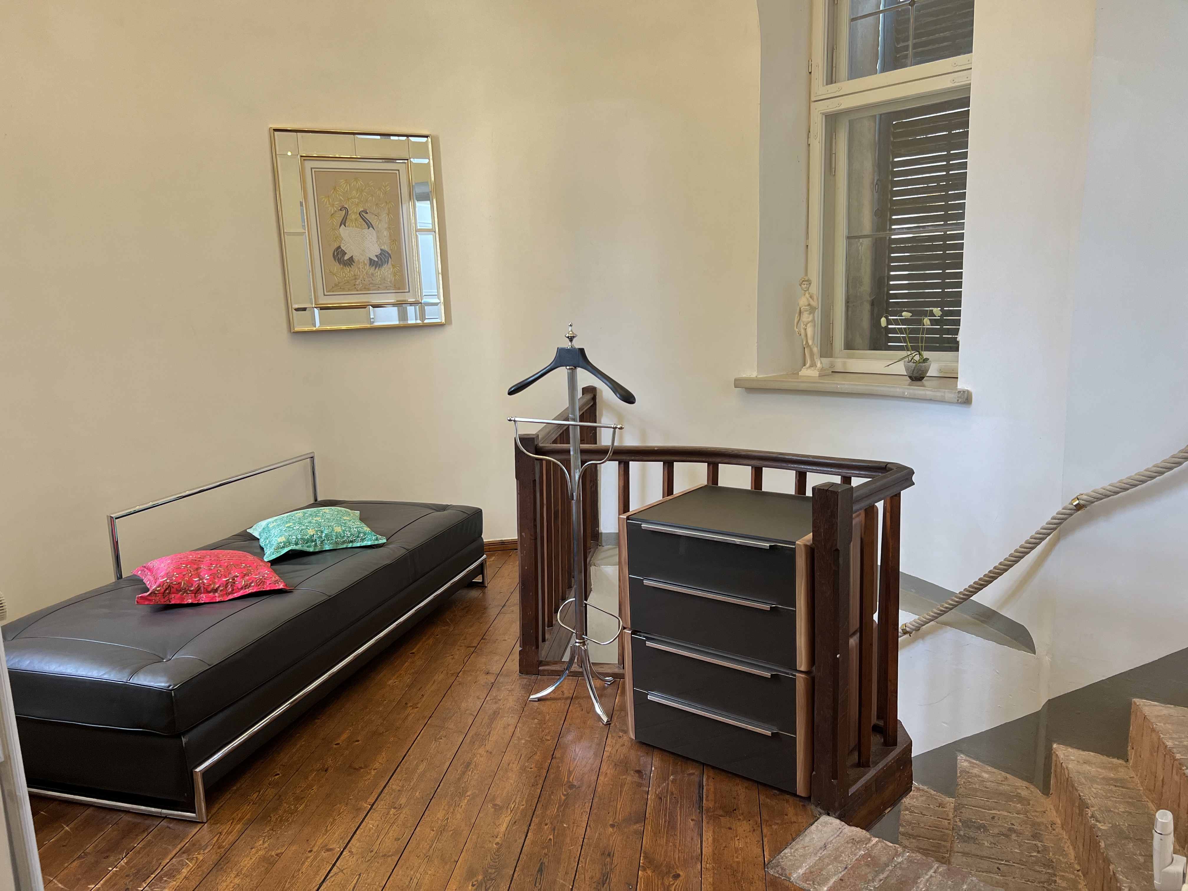 Von der Küche aus führt die alte Turmtreppe von 1521 nach oben in das Turmzimmer mit einer bequemen Designerliege mit Lederpolstern (90x200) als fünfter Schlafplatz. Von hier aus gelangen Sie zum großen Badezimmer mit Dusche, WC und frei stehender Badewanne.