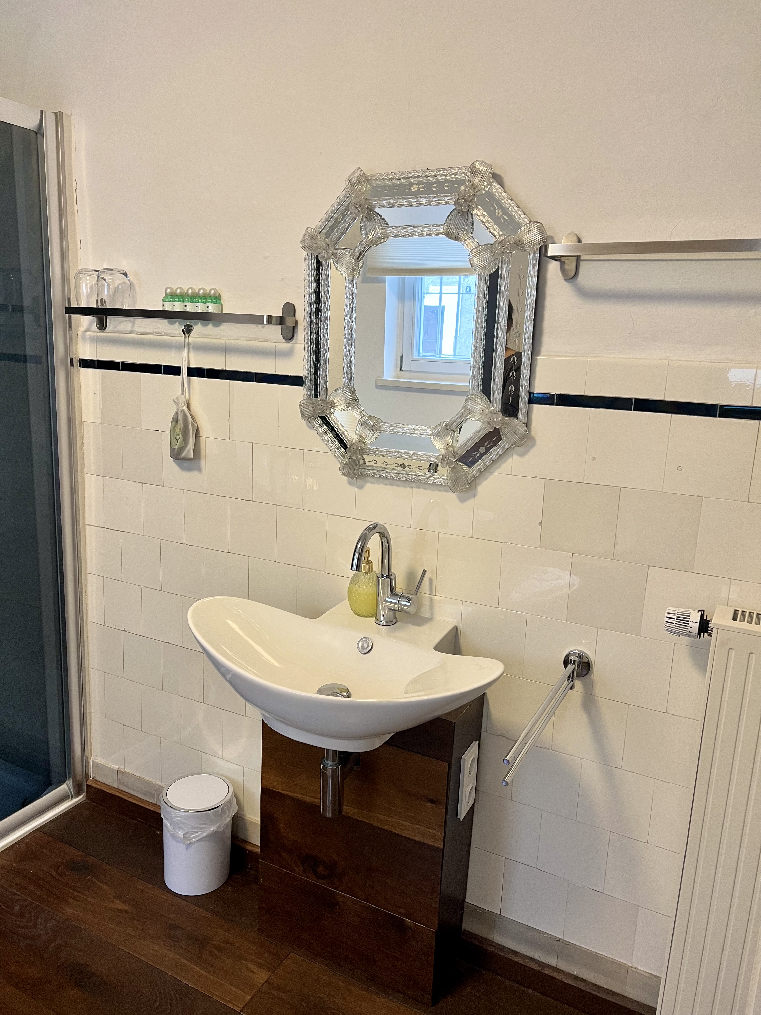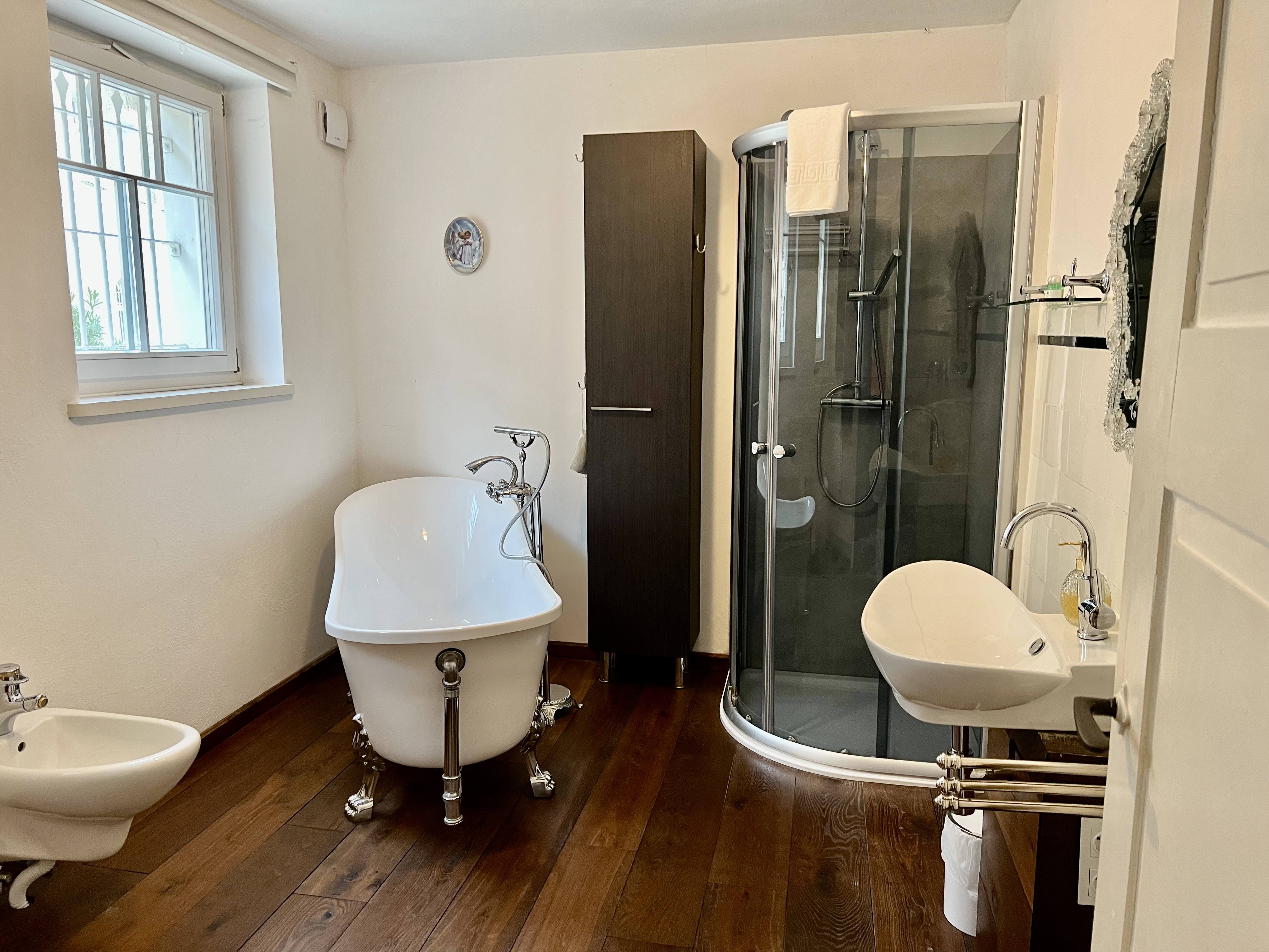 Die Rosengarten-Suite ist die perfekte Familienwohnung für bis zu sechs Gästen. Sie ist ideal für gemeinsam reisende Familien und Freunde mit einem Schlafzimmer für 2 Personen (Doppelbett 180x200 cm) und einem Wohnzimmer für vier weitere Gäste. Die großen bequemen Schlafcouchen (180x190cm) können gleichzeitig oder separat genutzt werden. Im Badezimmer finden Sie eine klassisch freistehende Badewanne, ein Bidet, Waschbecken und eine Dusche. Die original Wandfliesen aus den 1930er Jahren sind noch erhalten.