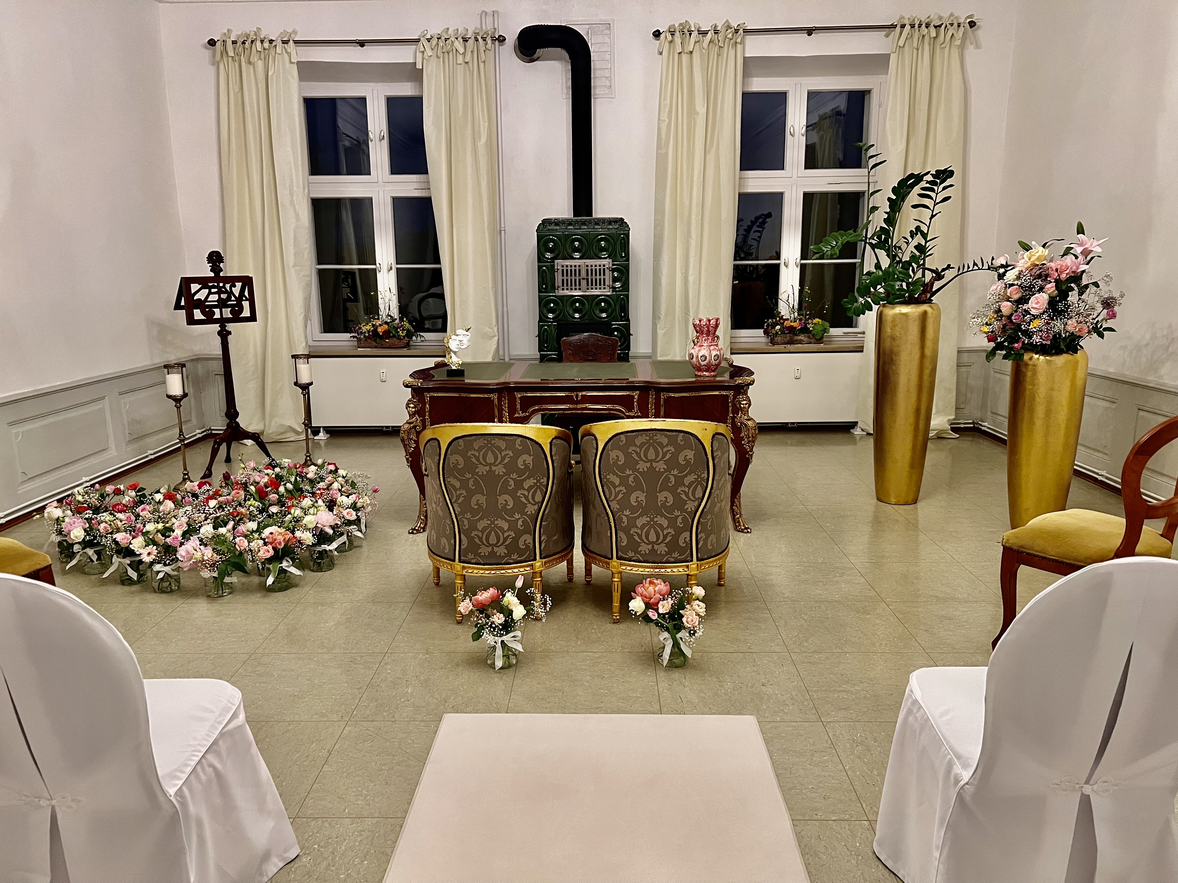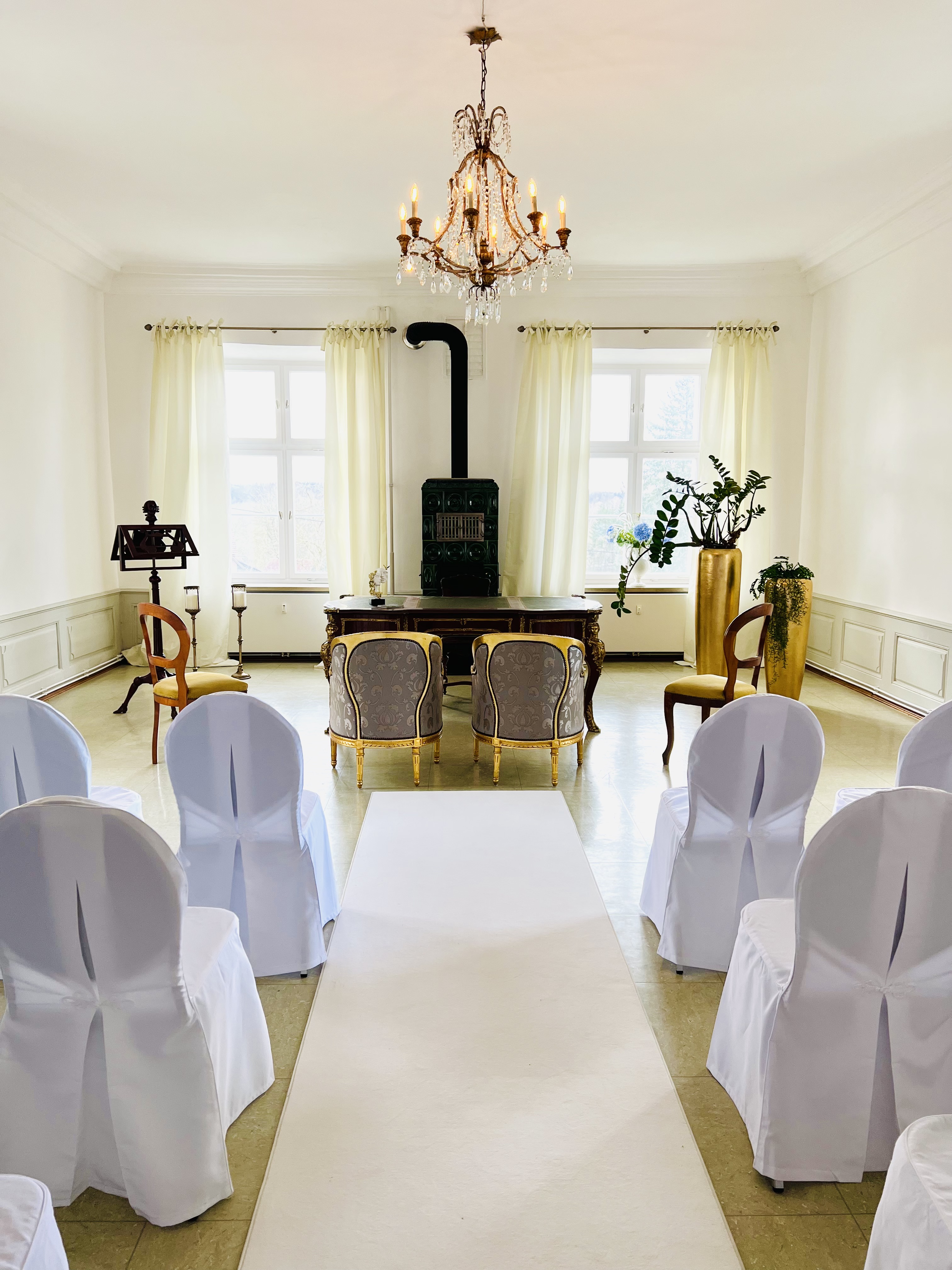 Unser wunderschöner und einmaliger Trausaal – weiß bestuhlt – ist für ca. 50 Personen geeignet.